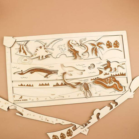 The Stuka Puka Dinosaur World Wooden Puzzle introduces kids to the reptiles that once walked the earth as well as the volcanic landscape! Take the lesson further by encouraging your child to: