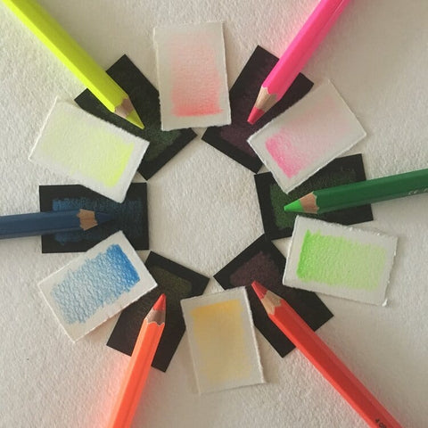 These highly pigmented neon-bright pencils are famous for their “gigantic intensity,” thanks to their extra-thick leads. They draw a creamily smooth chunky line; they are also sharpenable to a fine point for thin lines. Either way, they offer consistent quality. We love to use them for addressing & embellishing elaborate envelopes. We also admire their beautiful lacquered finish, which makes them a delight to hold. BWTM: They are break resistant, long lasting, smudge proof, and waterproof!