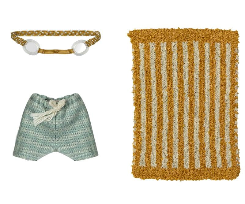 Vacation time. This set includes all essential accessories for a fun day at the beach: trunks, goggles, and a towel. It all fits the mice in size big brother/sister perfectly.