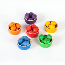 View full detailsThis set of wooden bowls and acorns from Grapat in rainbow colours, compels children to sort and collate. The activity of moving these small acorn...