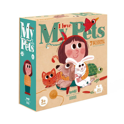 Londji Reversible Puzzles A cat, a dog, a rabbit, a fish, a bird and a turtle ... Let's play with our pets! 7 coluorful reversible puzzles so that ...