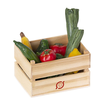 This wooden box is filled with miniature fruits and vegetables made of poly-resin with realistic details. A must have to go with the Maileg kitchen...