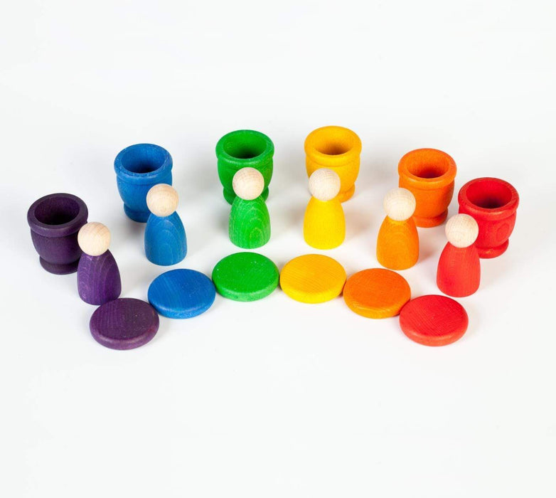 This Grapat Nins, Mates & Coins include 18 pieces in rainbow coloured timber. Contains: 6 Nins, 6 Mates and 6 Coins in 6 rainbow colours, includes cloth bag.