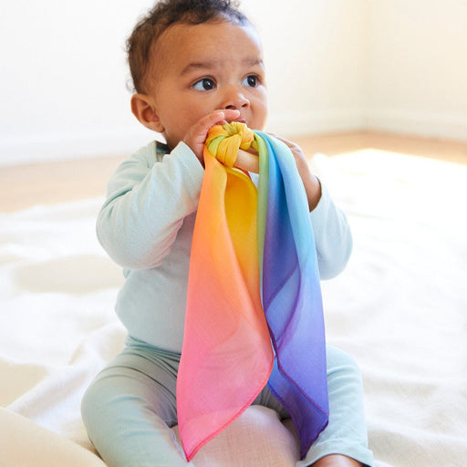 View full detailsDescription Baby's first silks! These "teething" toys are made of a maple wood ring with a 21" playsilk securely knotted on to it. Learn more about...