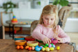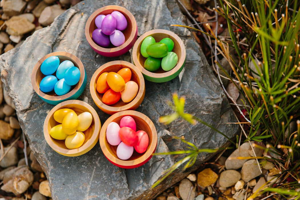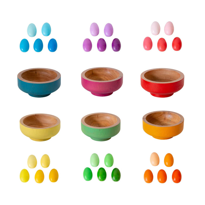 This set consists of 30 eggs representing a variety of shades and colours of the rainbow. The corresponding nest bowls provide the perfect complementary sorting receptacle. The bowls are also stackable, adding more learning possibilities to the play.