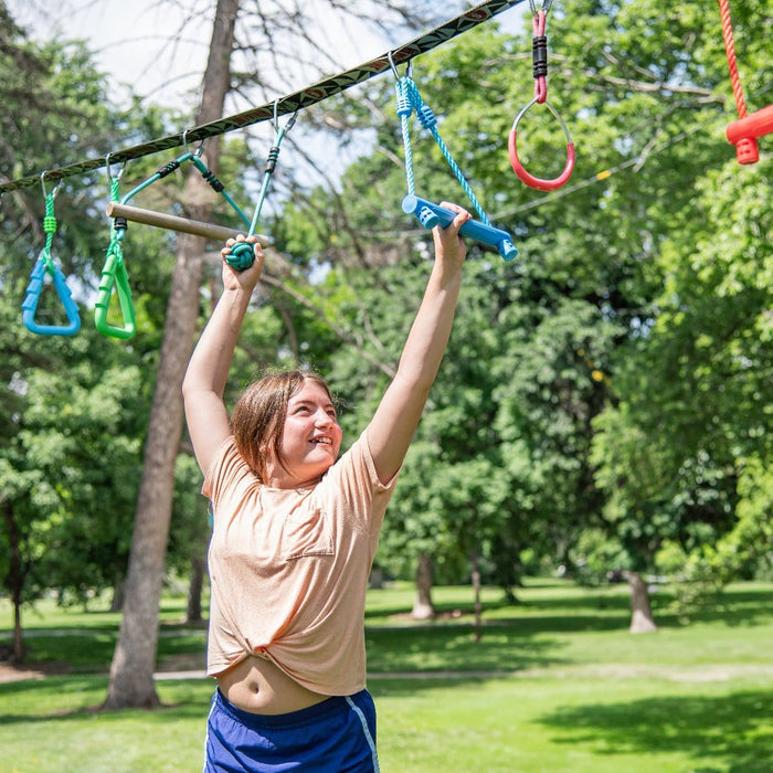 • COMBINATION NINJA ROPES COURSE ADVENTURE LINE XL 17.07m LENGTH: A Multi-purpose ninja warrior ropes course kit that is easy to set up in your backyard or garden.