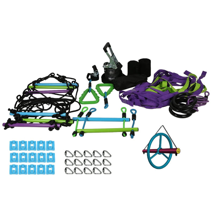 • OVER 10 OBSTACLES INCLUDED: 1 Spider Cargo net, 1 Rickety Bridge, 2 Gymnastics Tree Rings, 1 Tri Ring Climber 1.83m, 2 Monkey Bars, 1 Gym Ring 17m, 1 Ratchet Cover, Storage bag, 15 Delta Carabiners, 15 Line Clips.