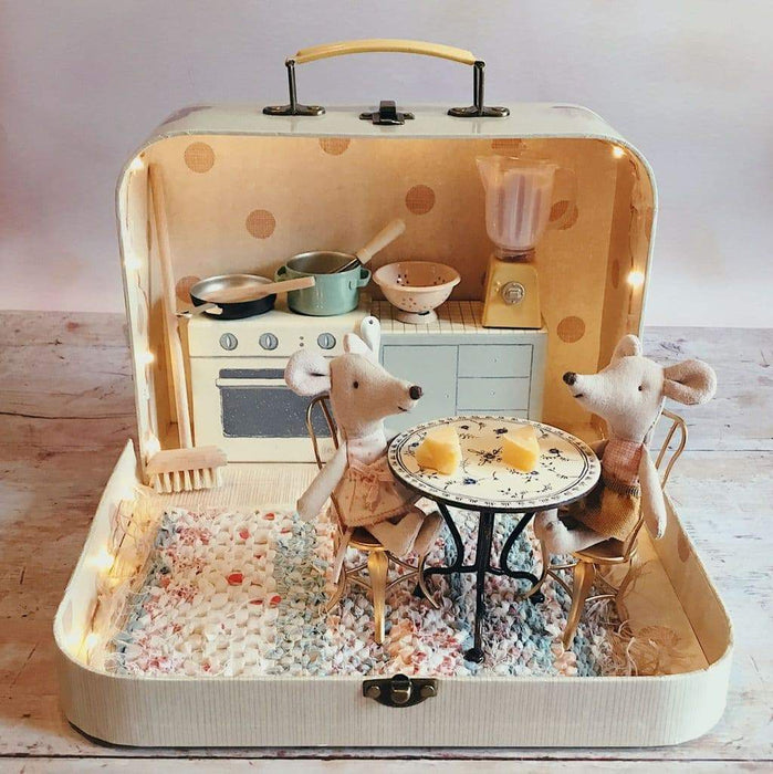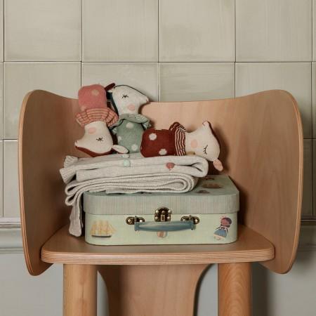 Going somewhere but still want to take all your favorite Maileg toys with you? Well this sweet suitcase with adorable Bambi Bambino themed print is the perfect item for you! On the inside there is a fresh pink polka dotted pattern so it's stylish on the inside and out!