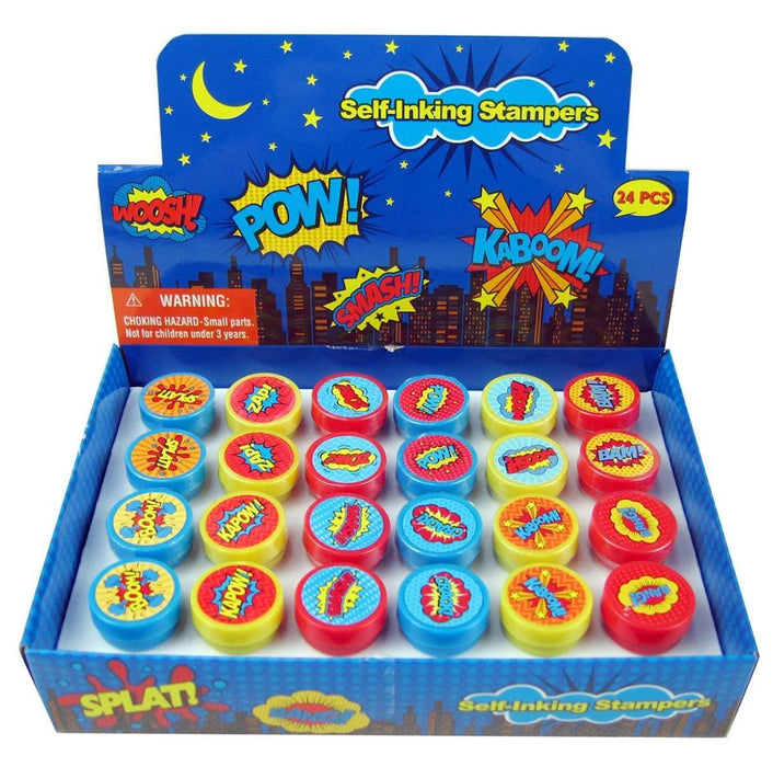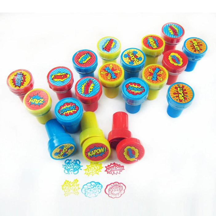 Put these awesome superhero word bubble stampers in your party favor bags! These stampers are also great for school projects, chore charts, creating your party invitations, scrapbooking and decorating stationery. Have this stamp assortment in your party favors bags or the crafts table at your party, for home, in the classroom, or in art class! Our stamps are non-toxic, lead-free have passed all CPSIA and ASTM testing. Safe for children to use.